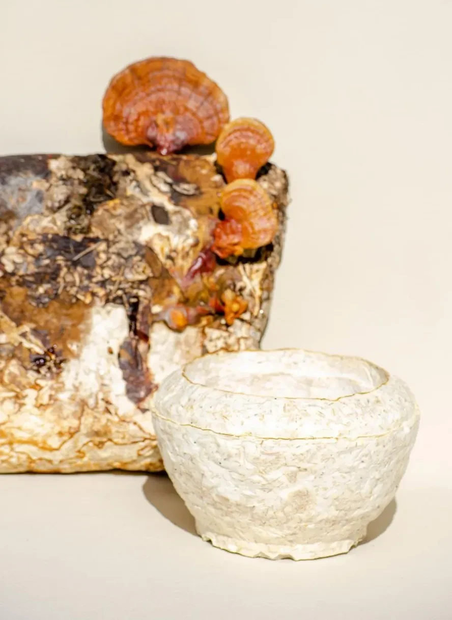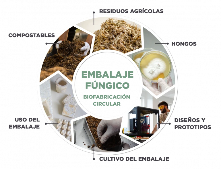 Nuestro trabajo consiste en aprovechar la tecnología del micelio que crece de forma natural sobre los residuos agrícolas, aglutinarlos y formar estructuras que dan vida a nuevos productos alternativos a los plásticos.