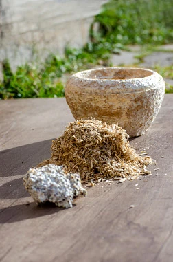 Usamos la paja de poroto (Phaseolus Vulgarius): un material renovable y biodegradable poco aprovechado, que normalmente es quemado. Este descarte agrícola local es desechado en los campos del Valle de Lerma en la Provincia de Salta (Argentina).